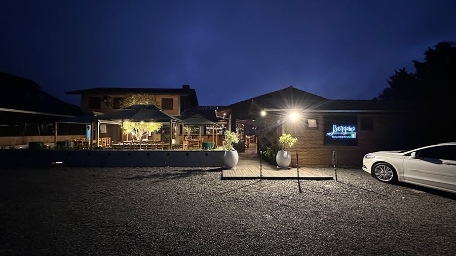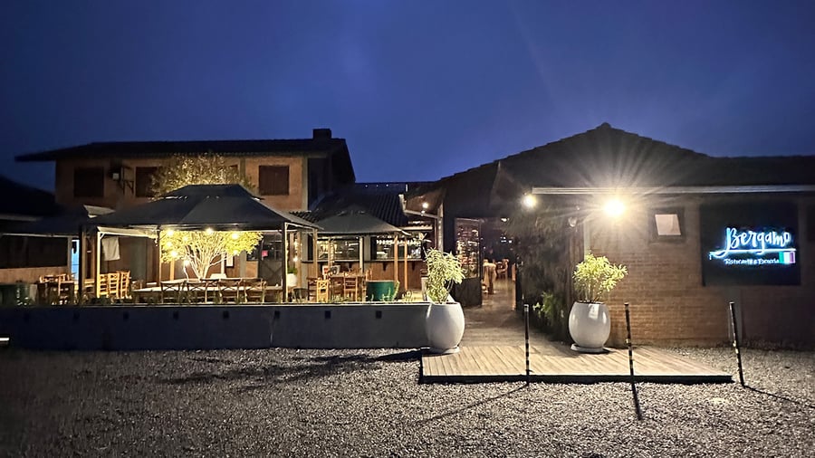 A área externa oferece um ambiente amplo, confortável e perfeito para grupos maiores. São três mesas de oito lugares dispostas de forma espaçosa, todas posicionadas debaixo de uma tenda que garante proteção, charme e clima agradável em qualquer ocasião. O espaço combina ar livre, boa gastronomia e atmosfera acolhedora, ideal para celebrar entre amigos, família ou pequenos eventos com praticidade e conforto.