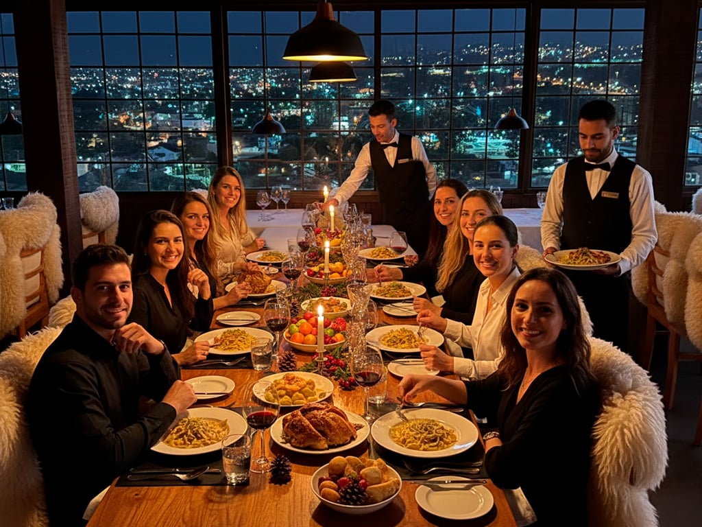 No Bergamo Restaurante em Monte Verde, a ceia de Natal ganha o toque da verdadeira arte de receber bem. No Salão da Vista da Cidade, a mesa para oito pessoas oferece um ambiente amplo, elegante e acolhedor, ideal para grupos que desejam celebrar a data com conforto, sofisticação e a vista iluminada da cidade como cenário.
